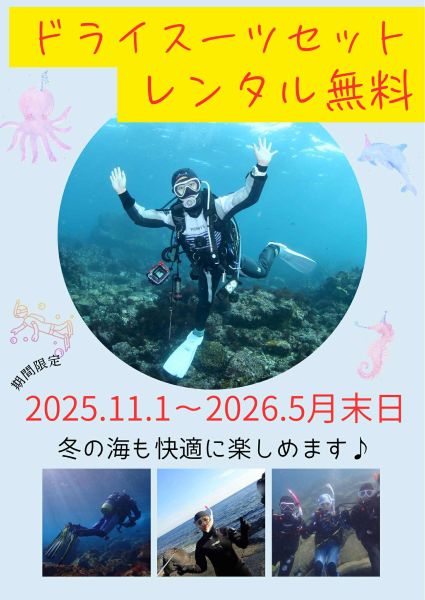 ダイブショップソルでは 11/1~5月末までレンタル器材無料キャンペーン を開催します!
